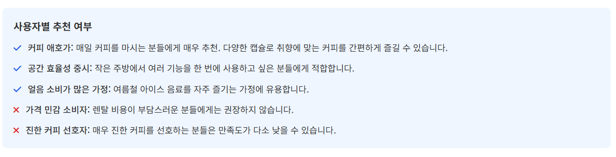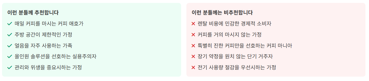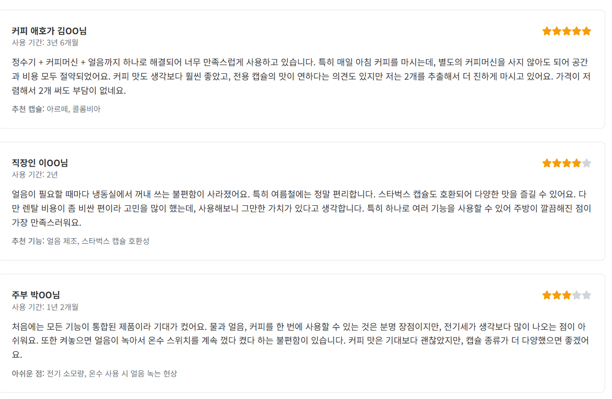 - 공간 절약: "커피머신과 정수기를 따로 둘 공간이 없었는데, 하나로 해결되어 좋아요."