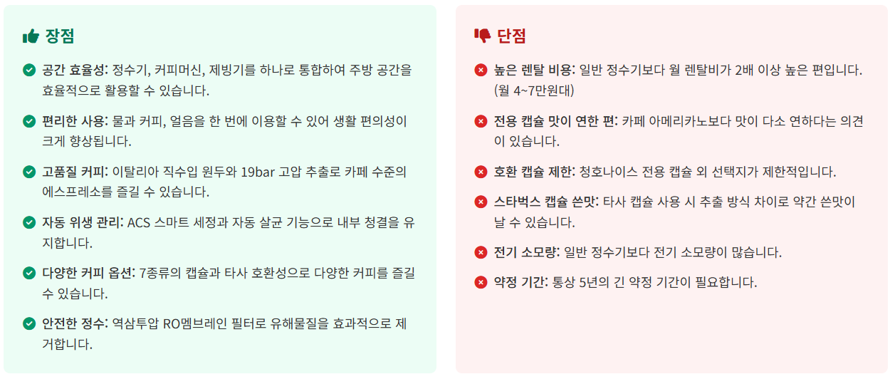 비록 월 렌탈 비용이 일반 정수기보다 높고, 커피의 맛이 전문 커피머신보다 다소 연할 수 있다는 단점이 있지만, 하나의 기기로 여러 기능을 사용할 수 있는 편리함은 큰 장점입니다. 또한 자동 위생 관리 시스템과 전문적인 케어 서비스는 안심하고 사용할 수 있는 신뢰성을 제공합니다.
