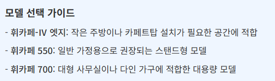 2016년 첫 출시 이후 지속적인 업그레이드를 거쳐 현재는 휘카페 IV-엣지, 휘카페 550, 휘카페 700 등 다양한 모델이 판매되고 있습니다. 특히 커피와 얼음을 동시에 즐길 수 있는 편리함으로 인해 가정과 소규모 사무실에서 큰 인기를 얻고 있습니다.
