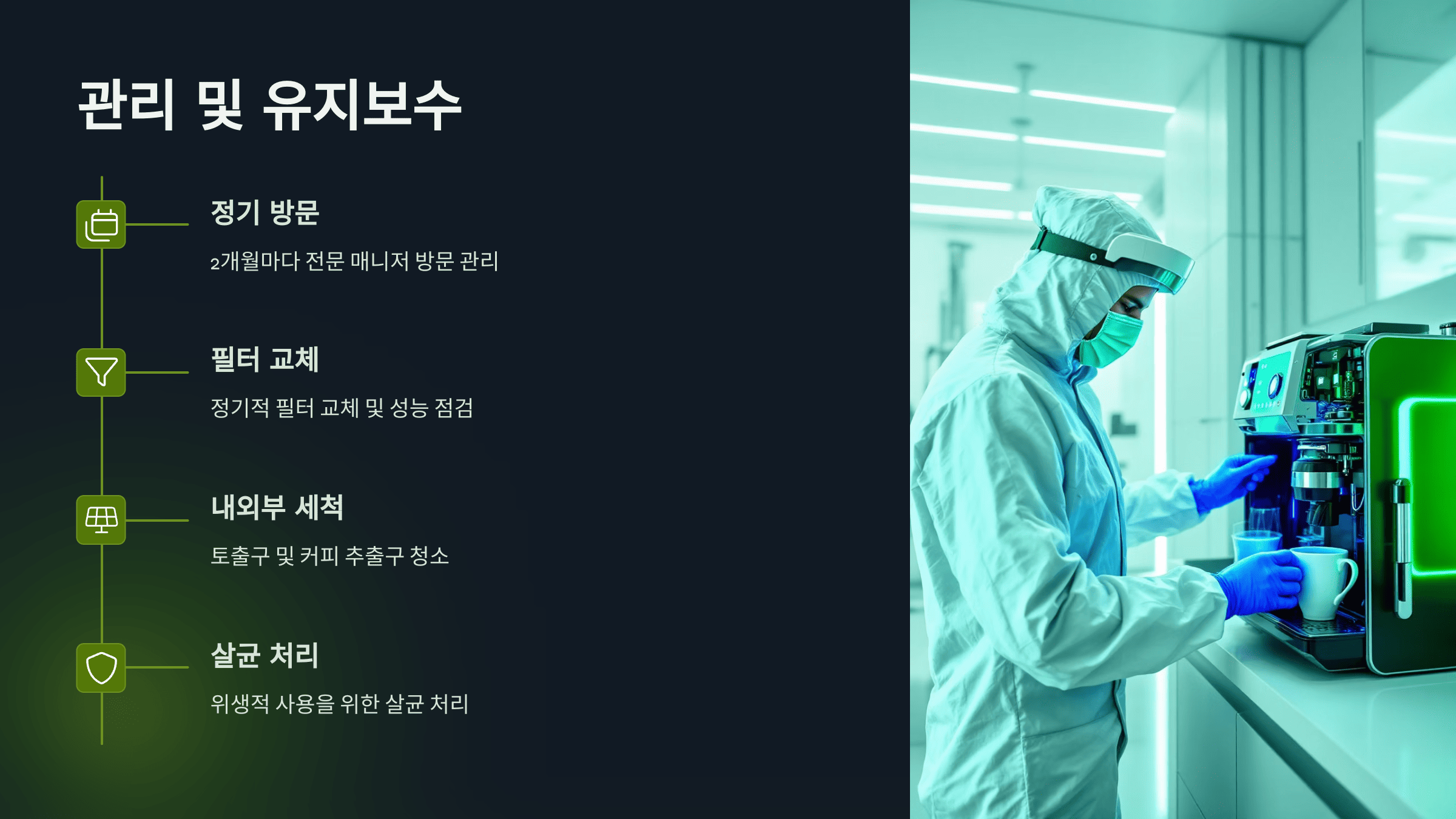 - 관리 내용: 필터 교체, 내외부 세척, 성능 점검, 살균 처리