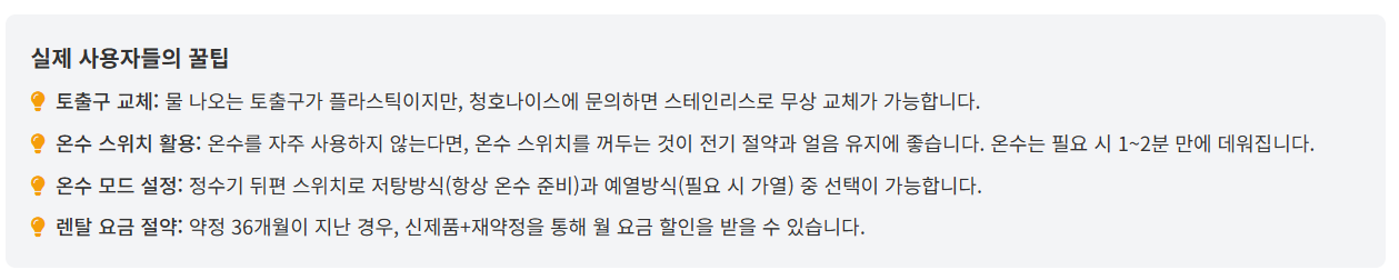 - 렌탈 비용 부담: "일반 정수기보다 월 렌탈료가 높아 경제적 부담이 있습니다."